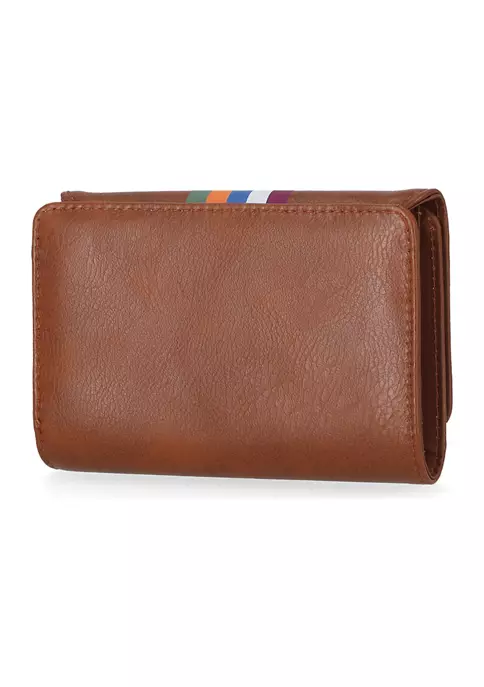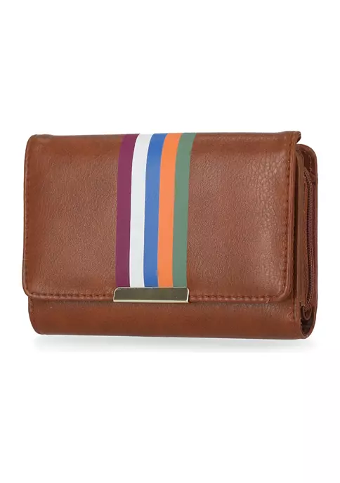 - Exterior: stripe on center of flap, gold-tone metal bar