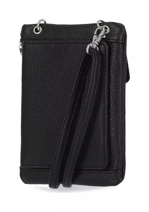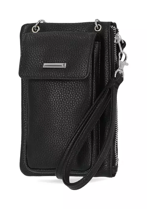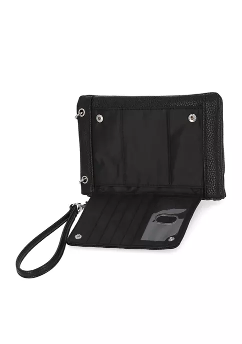 Interior: front cell phone pocket & right-side zip pocket plus an organizational backflip section with 4 credit card slots, ID window & slip pocket on the left side; Additional slip pocket & credit card slot on the right side.