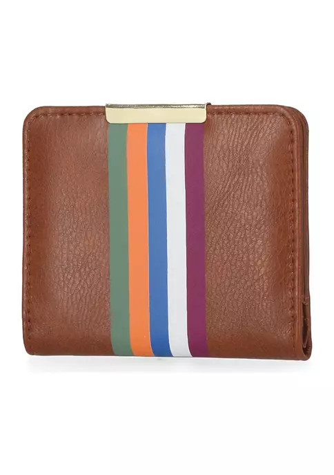 - Exterior: stripe on center of flap, gold-tone metal bar