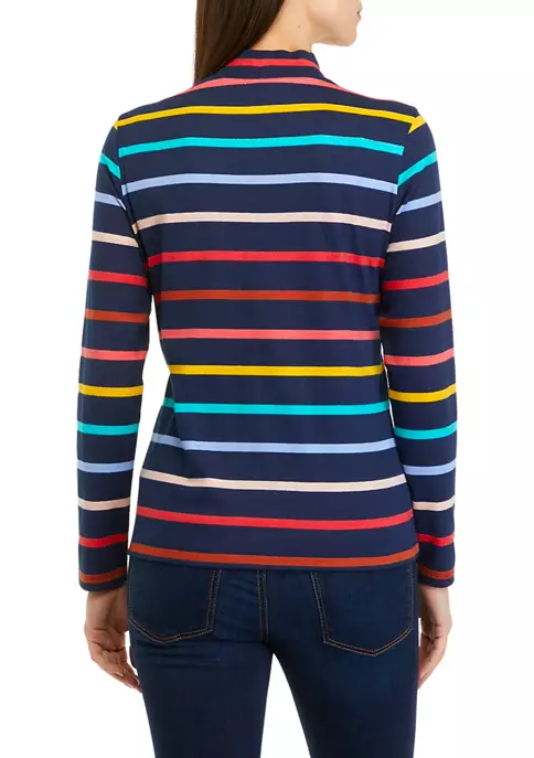Decked out in stripes, this top from Kim Rogers® features long set-in sleeves and a mock neck.