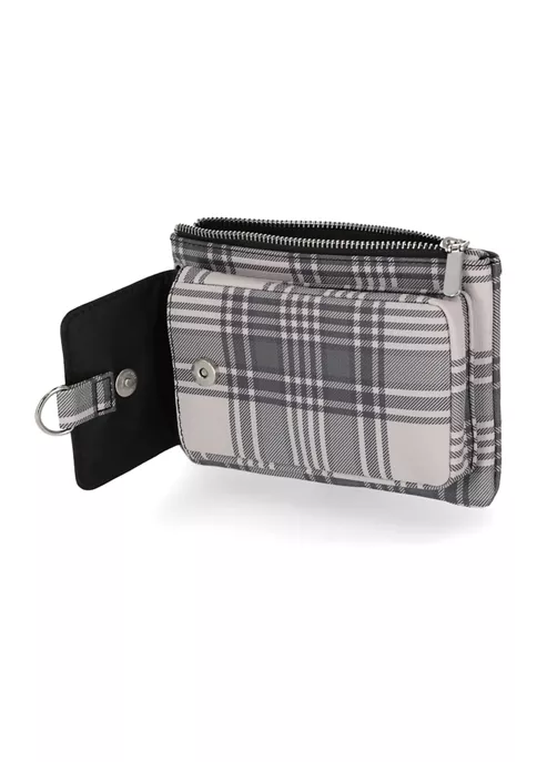 - Interior: front cell phone pocket & right side zip pocket plus an organizational back flip section with 4 cc slots, ID window &slip pocket on left side. Additional slip pocket & cc slot on right side.