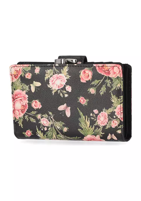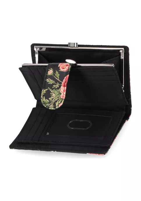 - Interior: kiss-lock frame pocket with divider, ID window, 17 credit card pockets, center flip section, 5 slip pockets, bill compartment