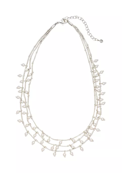 Crafted out of polished silver-tone metal, this entrancing necklace from Kim Rogers® features chic pearl accents and an illusional silhouette.